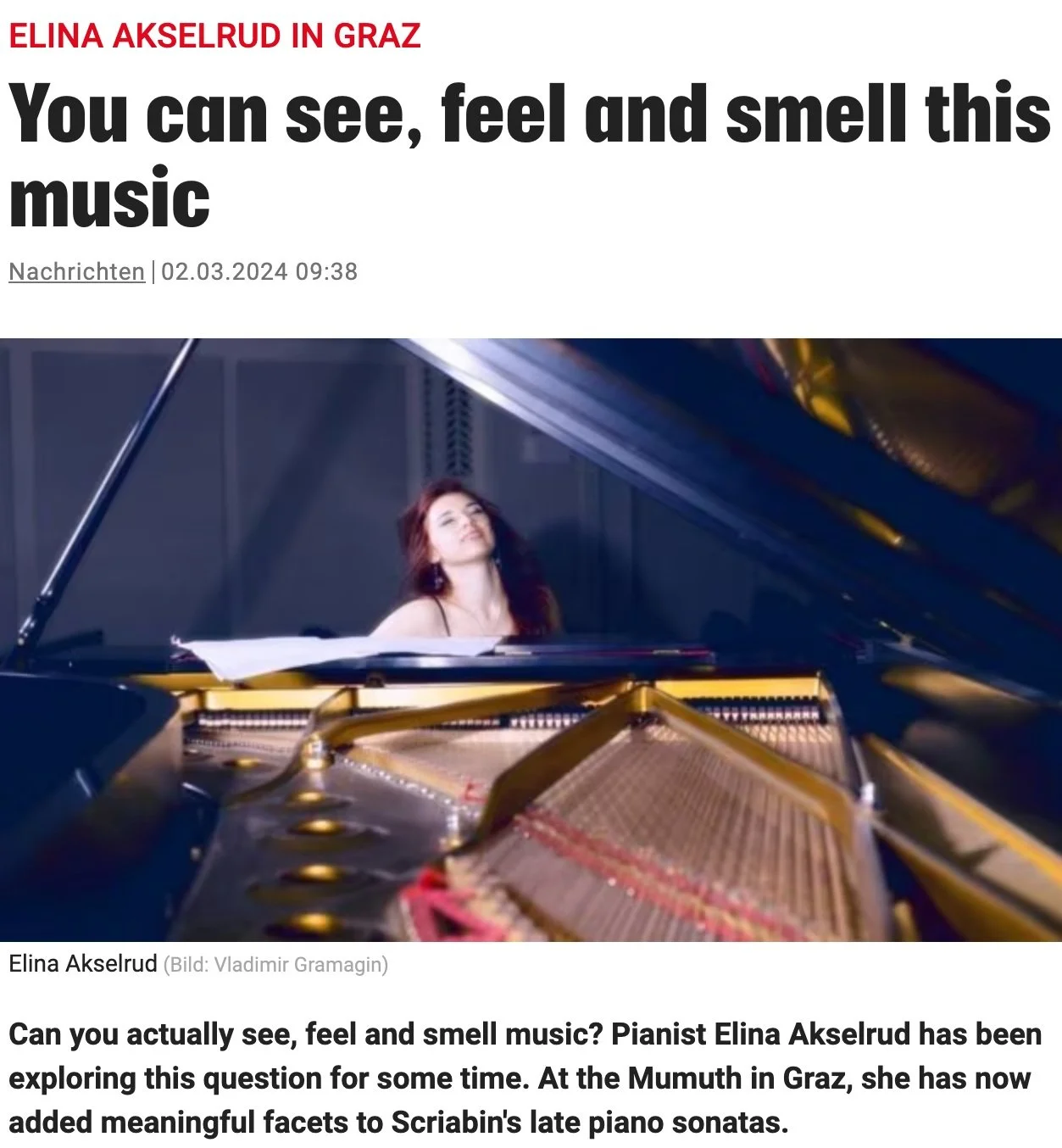 Can you see, feel and smell music? Pianist and doctoral student at Graz University of the Arts Elina Akselrud has long devoted her artistic research to the interweaving of aesthetic experience. Together with her collective "Intertwining Arts", the late piano sonatas no. 6 to 10 by Alexander Scriabin were now the starting point for this special interdisciplinary work.