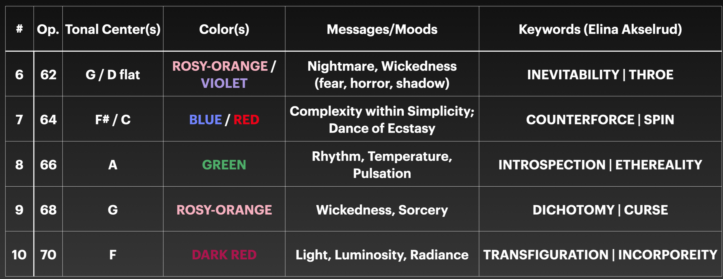 Scriabin intended to express particular contrasting mental states in his work. Moreover, the composer once mentioned that “in his Late Sonatas he had at last managed to transcend the realm of human emotion”. After a preliminary research, the following table was compiled for the Five Late Sonatas that includes the key(s), corresponding color(s), and the imageries or messages that each sonata seeks to imply: